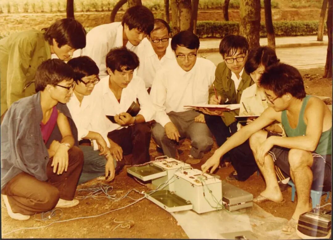 1985年,何继善(右四)与学生们在操作其发明的双频激电仪。