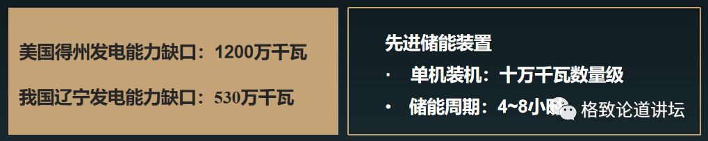 从刚才的两个例子中,我们可以看出电力的缺口问题不是一时的,而是几天的,缺口有上千万千瓦,而先进的储能单机容量只有10万千瓦,它的功率输出只有1万千瓦,并且是短时的。在时间和功率尺度的累积计算,实际上它们差了3到4个数量级。