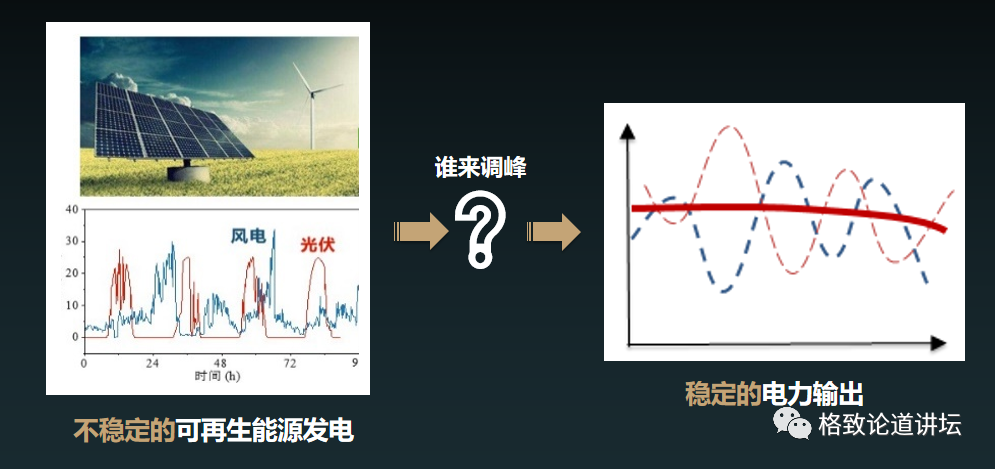 随着新型电气化的发展,我们对稳定电力输出的要求更加苛刻。所以在不稳定的可再生能源和要求苛刻的稳定电力输出之间存在一个矛盾。因此,我们需要有一个巨大的电源,在不稳定的可再生能源和稳定电力输出之间达成平衡。也就是说,在使用可再生能源的过程中,这个巨大的电源要时刻做准备,当没有可再生能源的时候,它就要立刻补上去,这就是调峰的概念。
