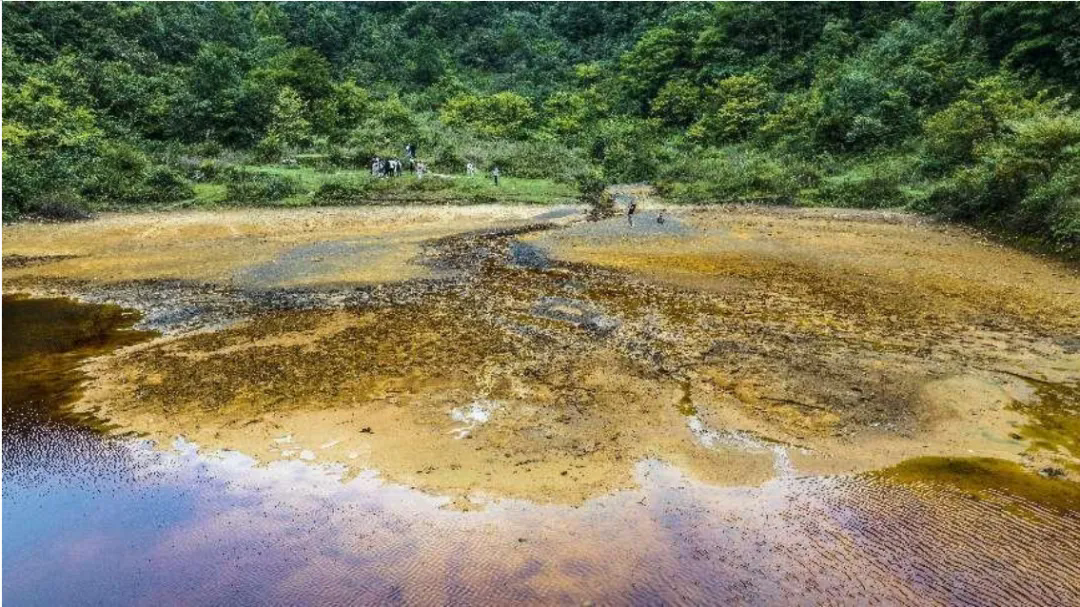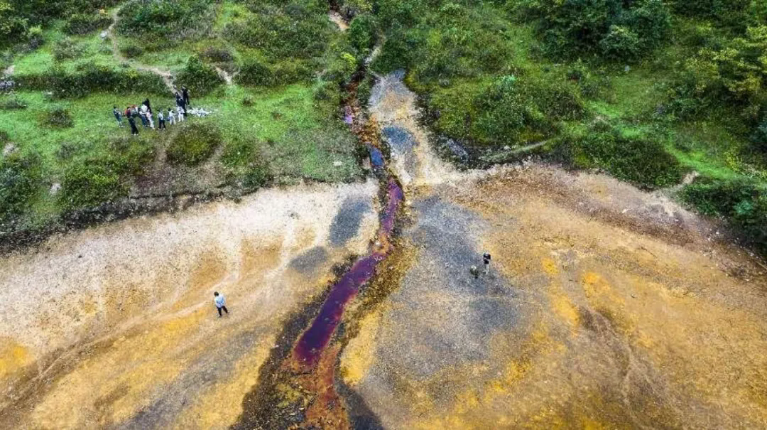 茶冲一带的出露地层主要依次为泥盆系、石炭系和第四纪组成,矿物组成主要有碳质泥岩、石英砂岩、铝土矿、赤铁矿、黄铁矿等,煤系和含铝地层分布广泛,其中的碳、铝、铁、硫矿物等风化、氧化、溶解后就会呈现为褐色、红色等。多雨的天然降水,以及草甸涵养的水分更是加速了这一化学反应过程。