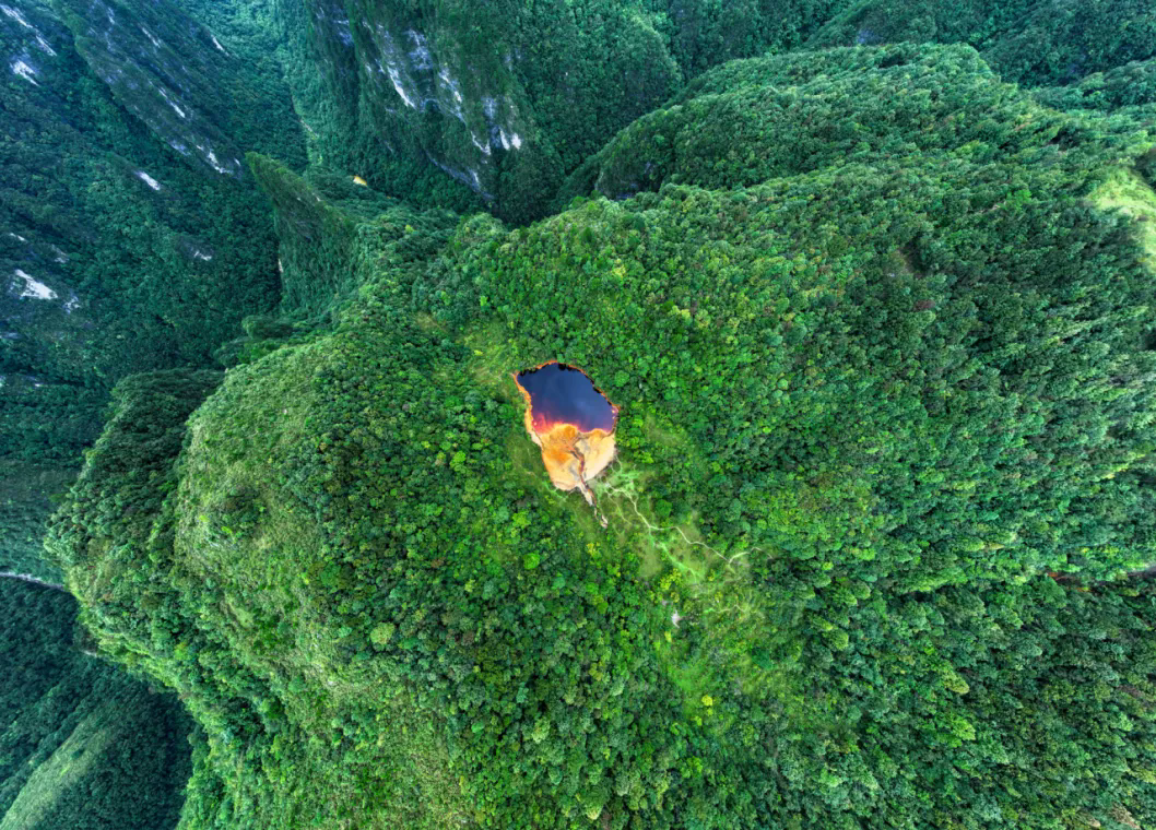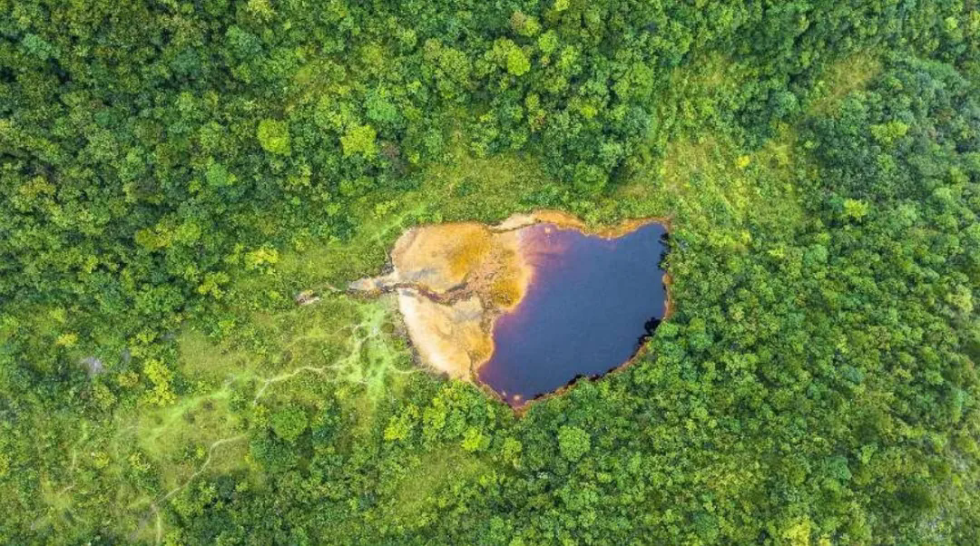 在贵州龙里高山草原深处一个叫茶冲的地方,绿色的群山环抱之中有一个神奇的山间水塘,塘水血红,临空俯瞰,山间水塘造型犹如动物的心脏,苍茫大地之中的溪水不断地涌入心形山塘,犹如鲜活的心脏还在脉动,驴友们将其称为“大地之心”。