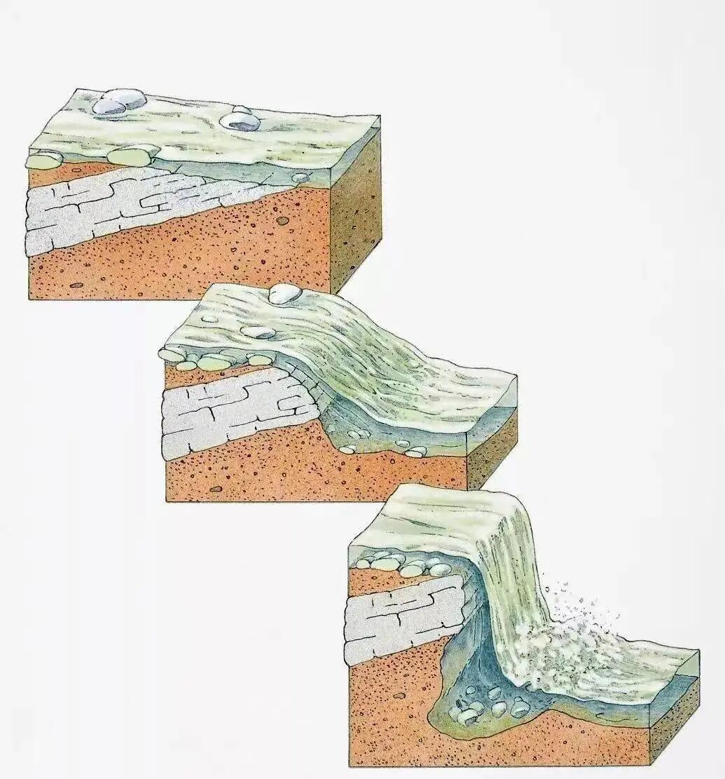 而由于组成河床的岩石软硬不均匀,下蚀作用作用的速度也有差异,因而造成谷底在纵向上常呈阶梯状。一般由坚硬岩石组成的谷底因抗侵蚀能力强,常突起形成陡坎。由于陡坎的存在使河水呈现出明显的跌水现象称为瀑布,比如我国著名的黄果树瀑布等。由于携带碎屑物从陡坎跌落,会猛烈冲击陡坎下部和河床的岩石,渐渐侵蚀,使陡壁上部悬空,最终因重力作用而垮落,导致瀑布的后退。