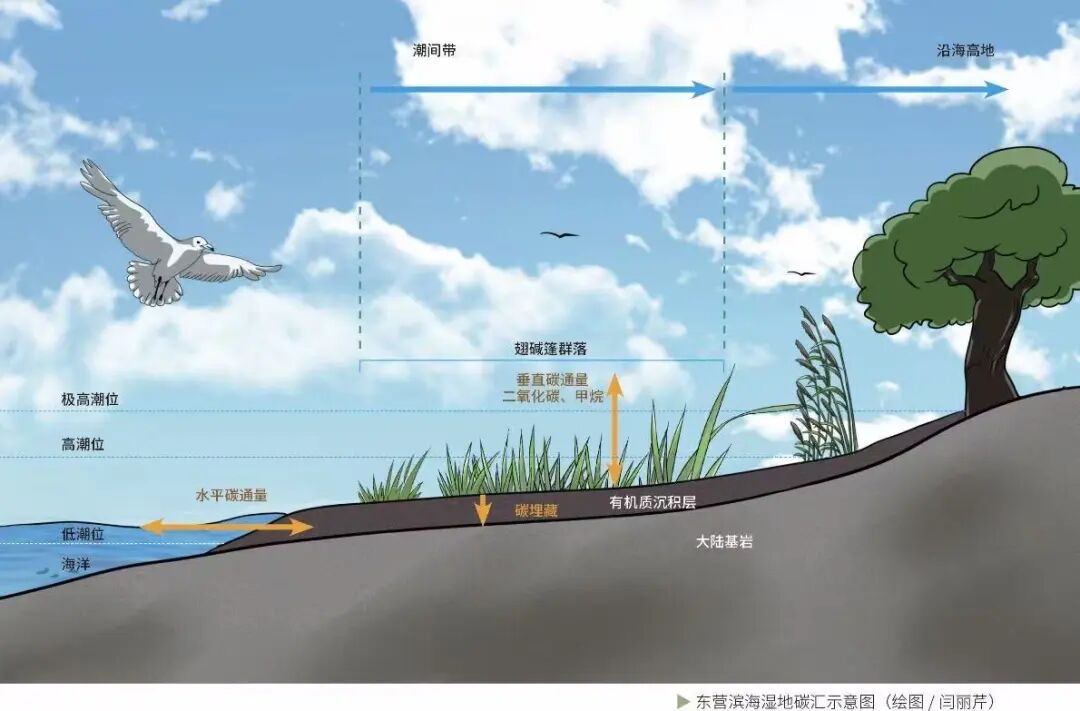 而东营湿地具有巨大的碳汇潜力,它的滩涂与黄河三角洲的植被和土壤,持续吸收并封存大气中的二氧化碳。此外,东营拥有大片红树林。与陆地生态系统不同,由于红树林的潮间带土壤多处于厌氧状态,有机碳分解很少,有利于有机碳在土壤中的积累,进而形成碳汇。红树林土壤可以不断累积有机碳,土壤碳含量会随之持续增长。