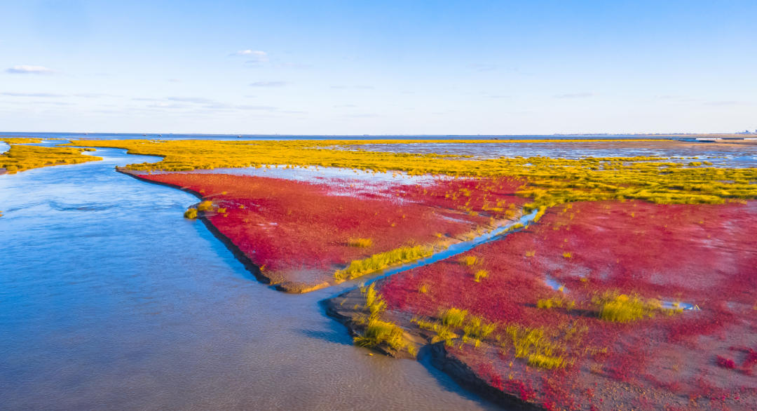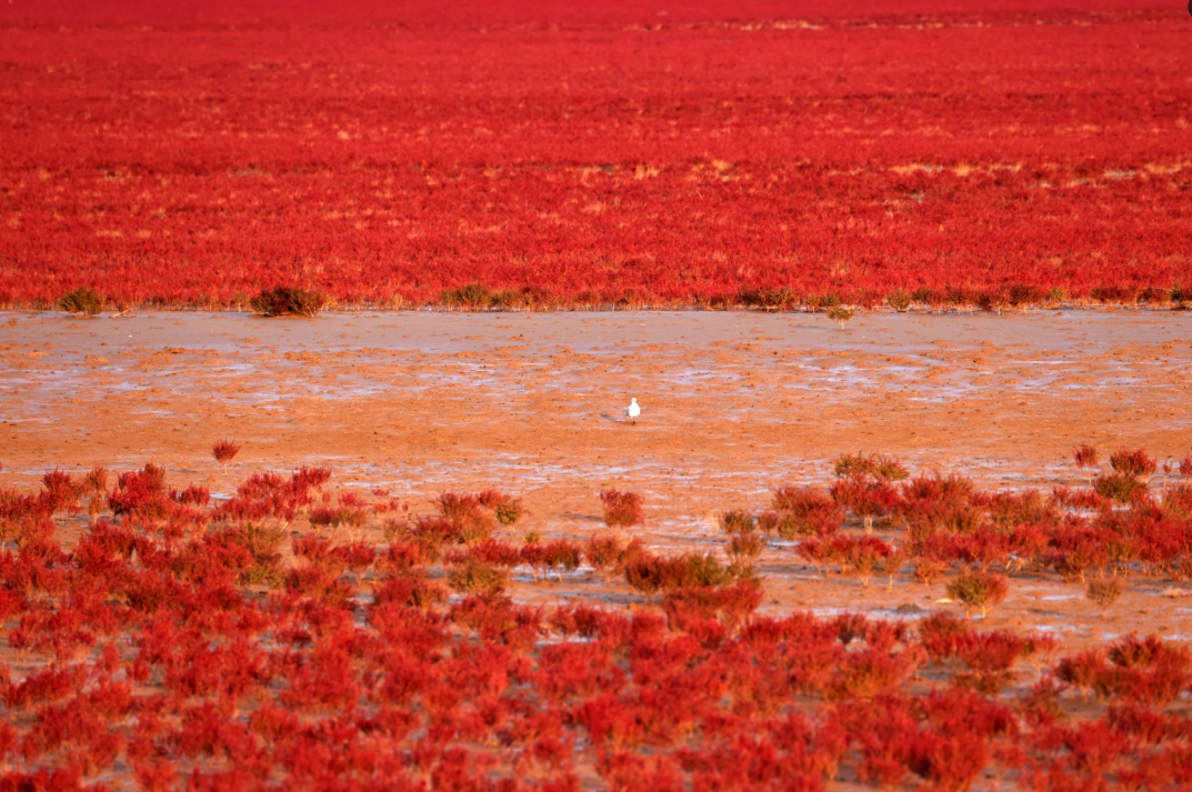 翅碱蓬自春至秋由绿变红,给广袤的湿地滩涂铺上了一层“红地毯”