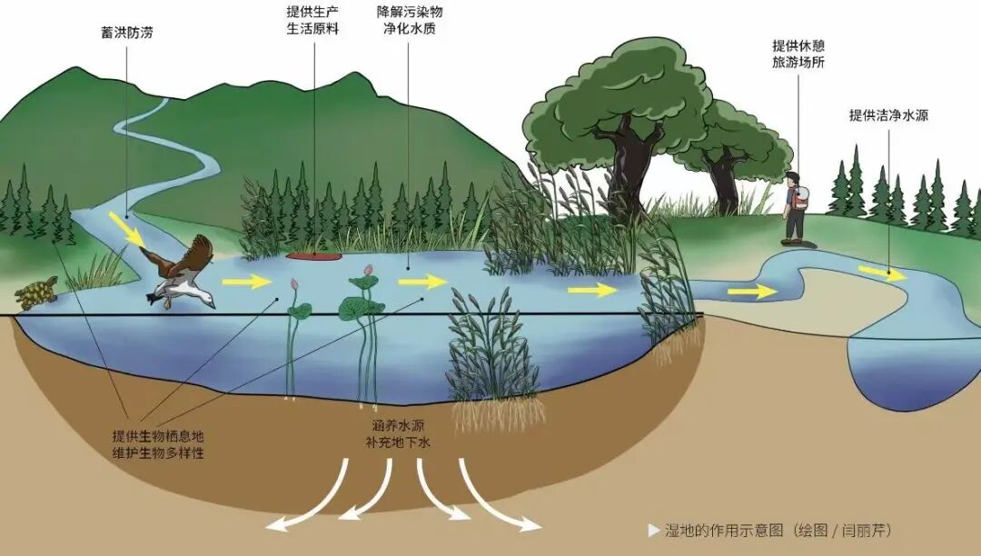 湿地可以调节气候、净化水质、防止洪涝灾害,对于维护区域生态平衡具有重要作用,也为当地居民提供了更加宜居的环境。