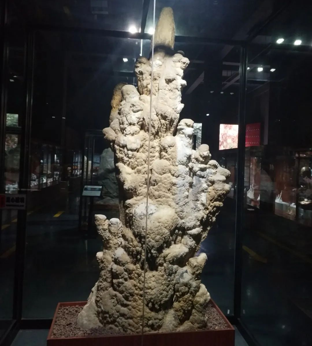 当洞顶有多个连续的地下水滴落点时,还会形成形态奇异的多头石笋,如我馆这件酷似群猴聚在树枝上一样的展品,“猴头”就是一个个石笋头。
