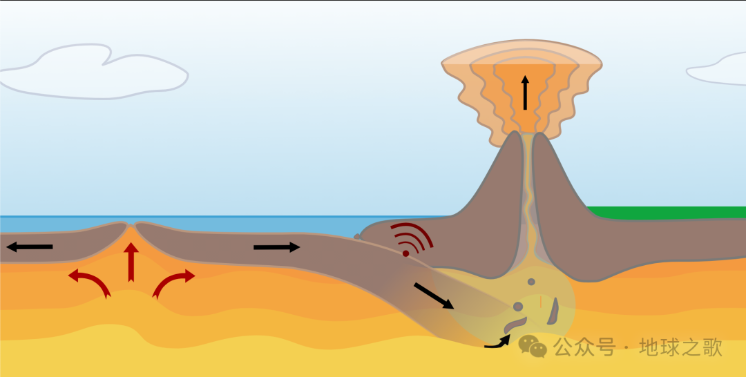 洋壳(左)俯冲潜入陆壳下方,进入地幔的洋壳熔融形成一座火山