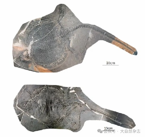 保存于兴义国家地质公园博物馆的2件康氏雕甲龟龙标本。上图为背视,下图为腹视
