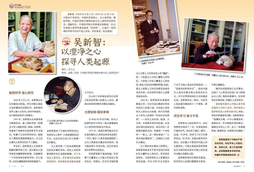 吴新智(1928—2021)是中国科学院院士、古人类学家,求学时虽遇战乱仍坚持学习,1947年考入上海医学院,后攻读古人类学研究生开启相关研究。他注重实地考察,带队发掘出重要古人类化石,还挑战“人类非洲起源假说”,与外国学者提出“多地区进化学说”,又提出“连续进化附带杂交”新假说。