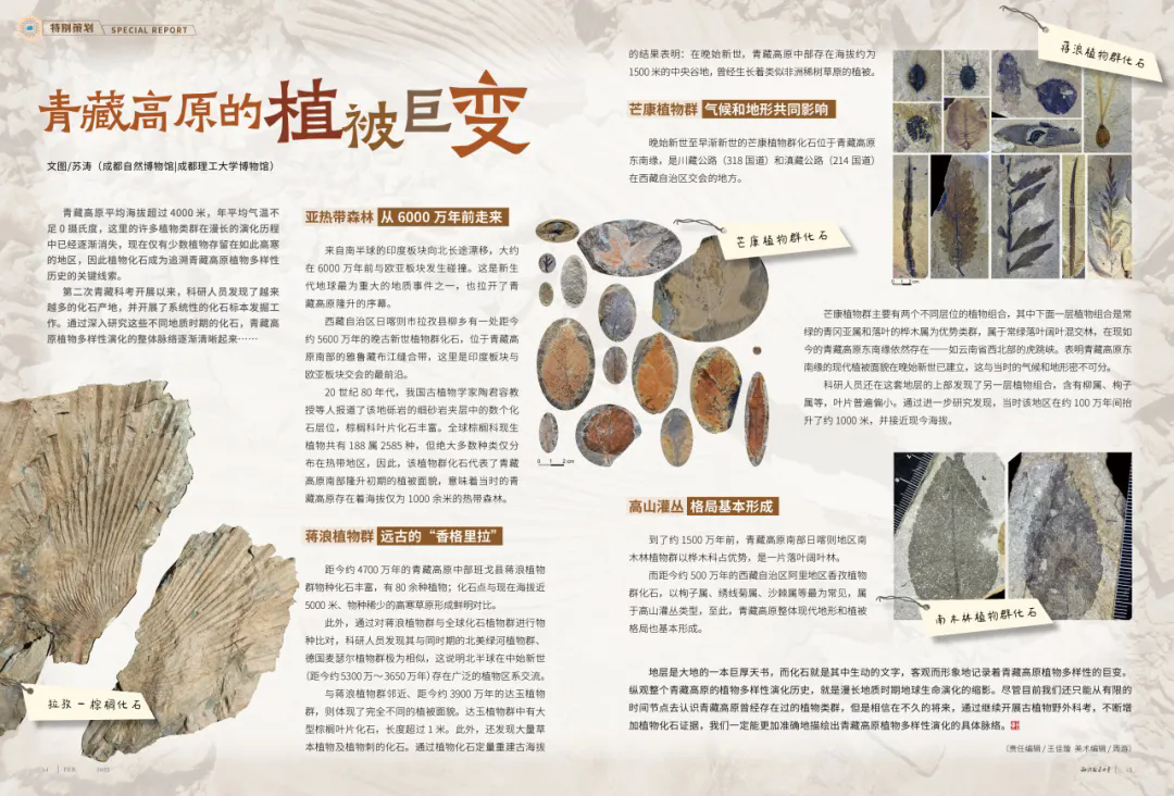 青藏高原的植物化石是追溯其植被多样性历史的关键线索,科研人员通过化石发掘梳理出其植被巨变脉络:约6000万年前印度洋板块与欧亚板块碰撞,青藏高原开启隆升,5600万年前其南部曾有海拔仅千余米的热带森林,4700万年前蒋浪植物群展现出物种丰富的“香格里拉”风貌,还存在跨洲际植物交流,约1500万年前高原以桦木科为主,500万年前高山灌丛格局基本形成,化石记录完整呈现了这一演化过程。