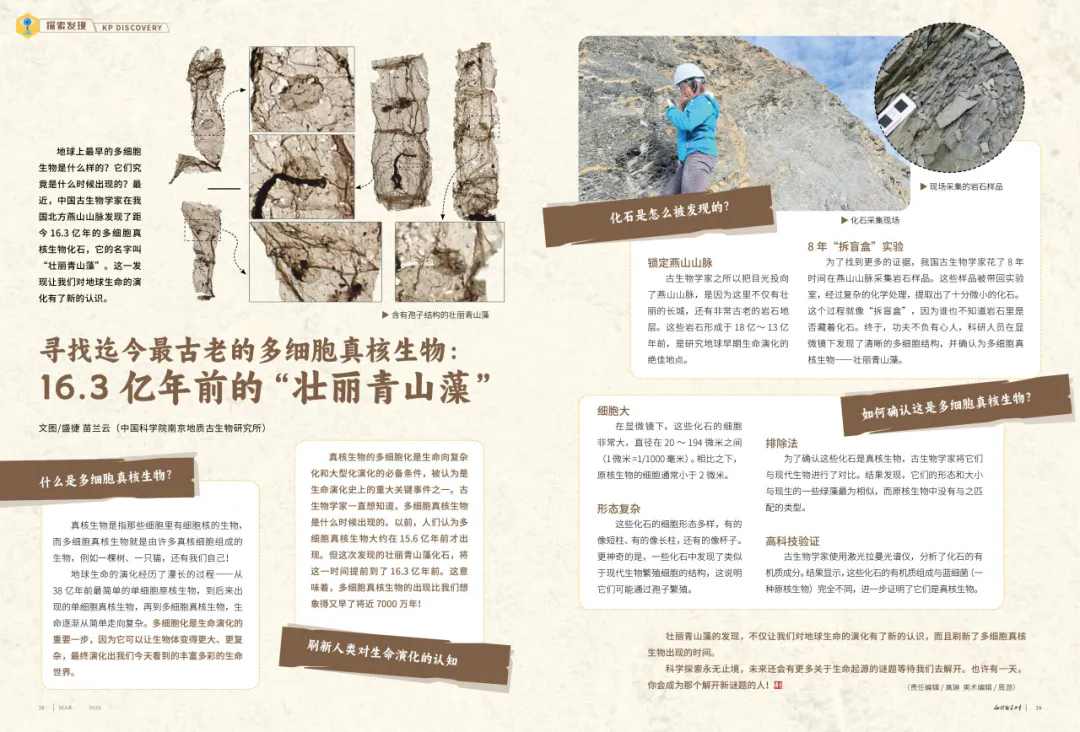 我国古生物学家在燕山山脉发现距今16.3亿年的多细胞真核生物化石“壮丽青山藻”,将多细胞真核生物出现时间从15.6亿年前提前近7000万年。研究者锁定燕山山脉古老地层,经8年采样与实验分析化石结构,通过排除法对比形态、激光拉曼光谱仪分析有机质,确认其为真核生物。