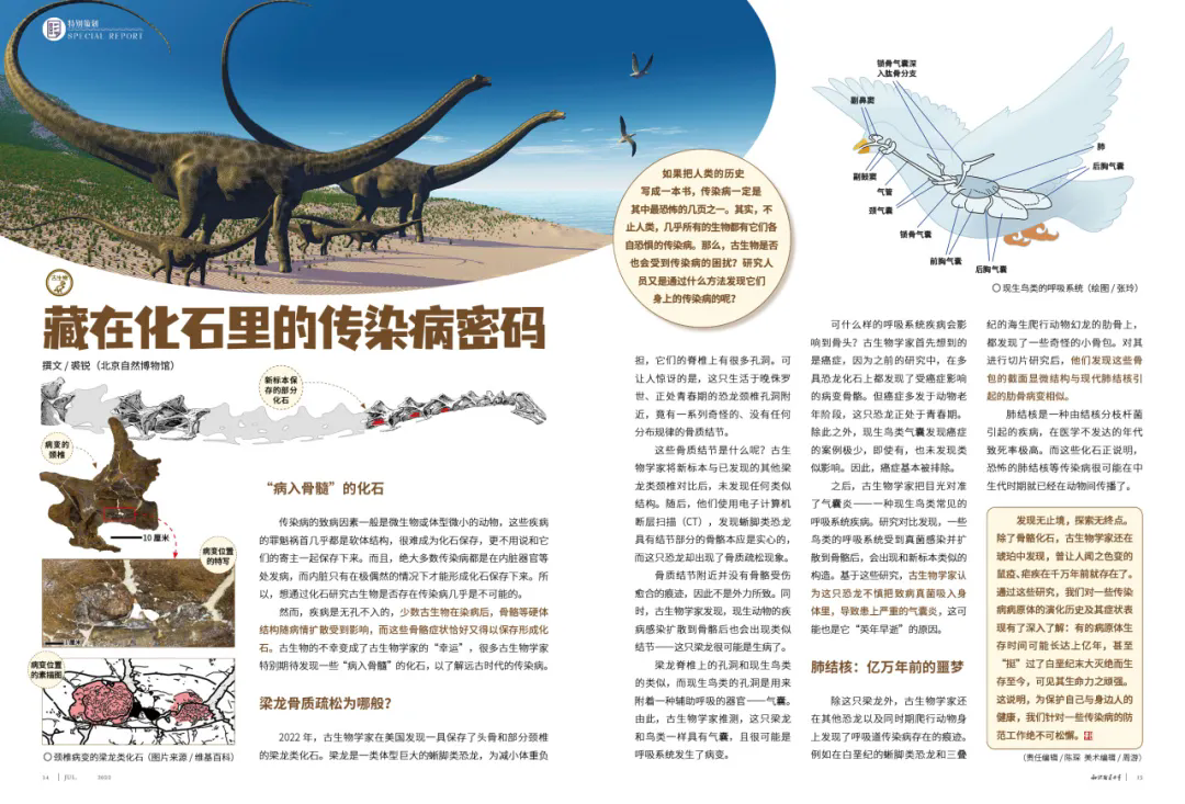 不止人类,几乎所有生物都有各自的传染病,古生物也可能受传染病困扰,但病原体多为软体结构,难成化石,仅骨骼等硬体结构偶能留存,古生物学家借此研究远古传染病。2022年发现的梁龙化石有奇怪骨质结节,经对比和CT扫描,排除癌症后,确定其气囊因真菌感染引发呼吸道疾病,这也是它“英年早逝”的原因。
