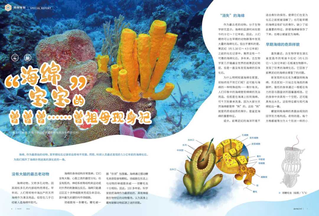 海绵起源约8亿~7亿年前,但寒武纪前化石记录缺失。直到后期科研人员在湖北发现6.35亿~5.38亿年前的螺旋网格海绵化石,其形态、结构与现代海绵一致,表面网格为康托尔集型分形结构,被命名为康托尔螺旋网格海绵。