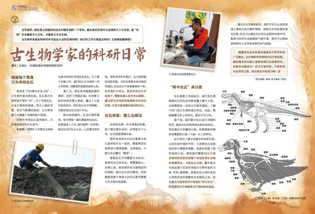 古生物学是研究远古时期生物的学科,古生物学家的科研日常围绕化石展开:为寻化石,他们踏遍地球各处,野外发掘需先依据地质知识选区域、剥表土、划网格作业,且发掘过程常伴随失望,需结合地质现象推断古环境才能精准找化石。找到的化石需带回实验室修复,修复后还要依“将今论古”法,结合古生物学基础与化石形态特征分类、定名。