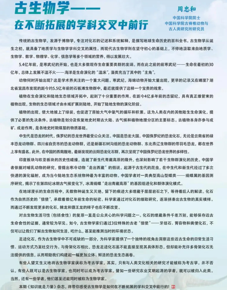 周忠和(中国科学院院士、中国科学院古脊椎动物与古人类研究所研究员)在《知识就是力量》杂志2024年11月刊中的卷首语提到:传统的古生物学,发源于博物学,专注对化石的记述和系统解释,是撰写地球生命历史的百科全书。