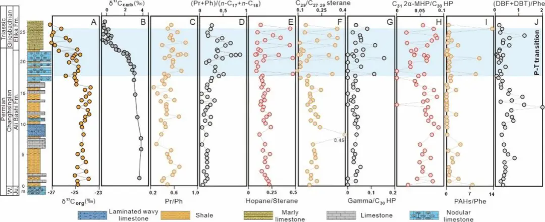 研究团队对伊朗西北部扎尔地区一套跨越二叠纪与三叠纪界线Zal剖面开展了高精度生物标志物分析。这些被称为“生物标志物”的有机分子,源自古代生物体,稳定地保存在岩石中,能准确告诉我们当时海洋里生活着哪些微生物,陆地上又发生了什么。