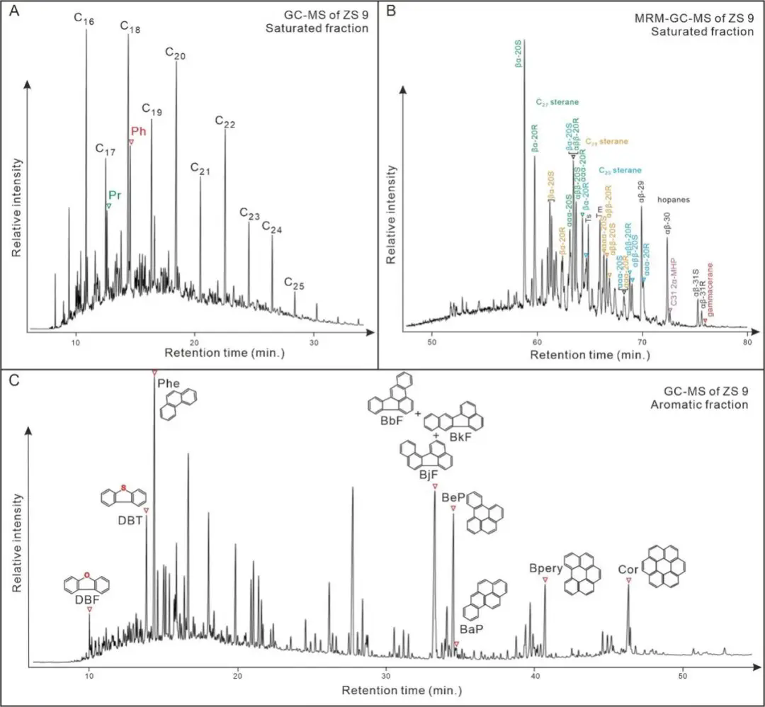 图1 伊朗Zal剖面样品气相色谱图及对应的生物标志化合物