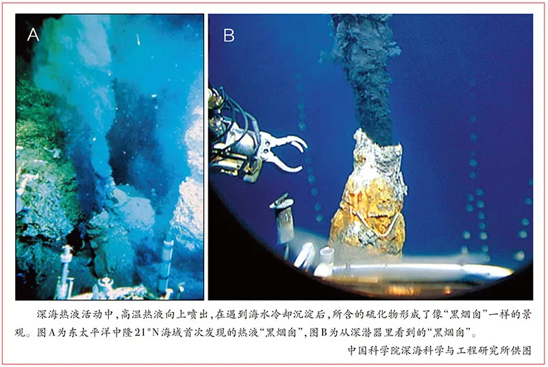 深海底部的双向运动。深海热液是20世纪海洋科学的重大发现之一,包括高温热液和低温热液。1979年,美国的载人深潜器“阿尔文”号在东太平洋进行深潜考察时,发现海底有2米高的“黑烟囱”向上喷出滚滚浓烟。原来,这是渗入地壳的海水与上升的岩浆接触后,形成的富含金属元素的热液,即深海热液。350℃的高温热液向上喷出,在遇到海水冷却沉淀后,所含的硫化物形成了像“黑烟囱”一样的景观。人们由此推测,深海热液是岩浆活动的副产品。此后,又经过30年的探测,全球累计发现500多处活动的热液口,其中,一半分布在板块扩张的大洋中脊,一半分布在板块俯冲的火山弧一带。除了岩浆活动,上地幔的橄榄岩在洋中脊或者俯冲带出露,与海水发生化学反应,也能产生热量而引起热液活动。不过,这种热液温度只有40℃到90℃,被称为低温热液。2000年,“阿尔文”号在大西洋中脊附近发现了方解石等构成的“白烟囱”。“白烟囱”就是低温热液的产物,可以形成10米到60米的尖塔。比深海热液分布更广的是冷泉,也就是天然气水合物的甲烷泄出口。在深海海底高压低温的条件下,甲烷很容易被包在水冰分子里,形成天然气水合物(可燃冰)。但是水合物在海底并不稳定,温度压力稍有变化就会放出气体,形成冷泉。热液和冷泉从海底自下而上向海水输送物质,海水自上而下向地壳渗透、海底板块向下俯冲,在深海海底形成双向运动的物质和能量交换。