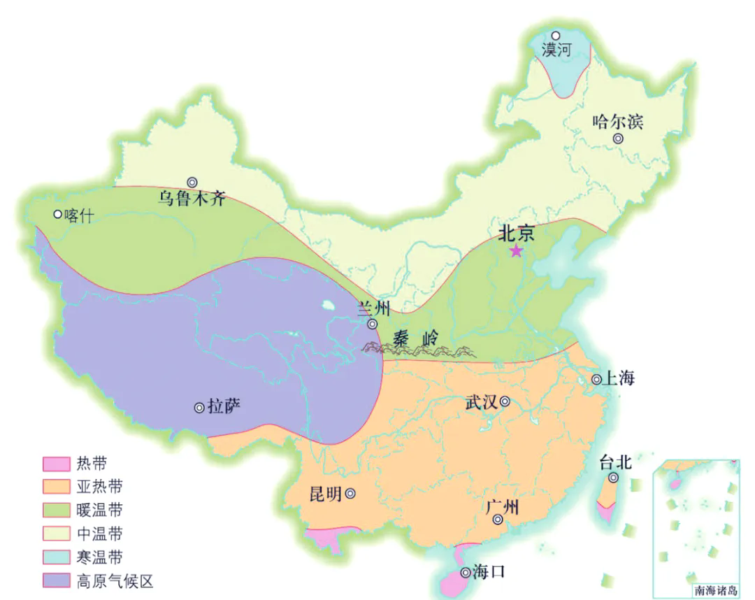 秦岭山脉大致与中国1月0℃等温线和800毫米年等降水量线完美重合,成为温带和亚热带分界线。