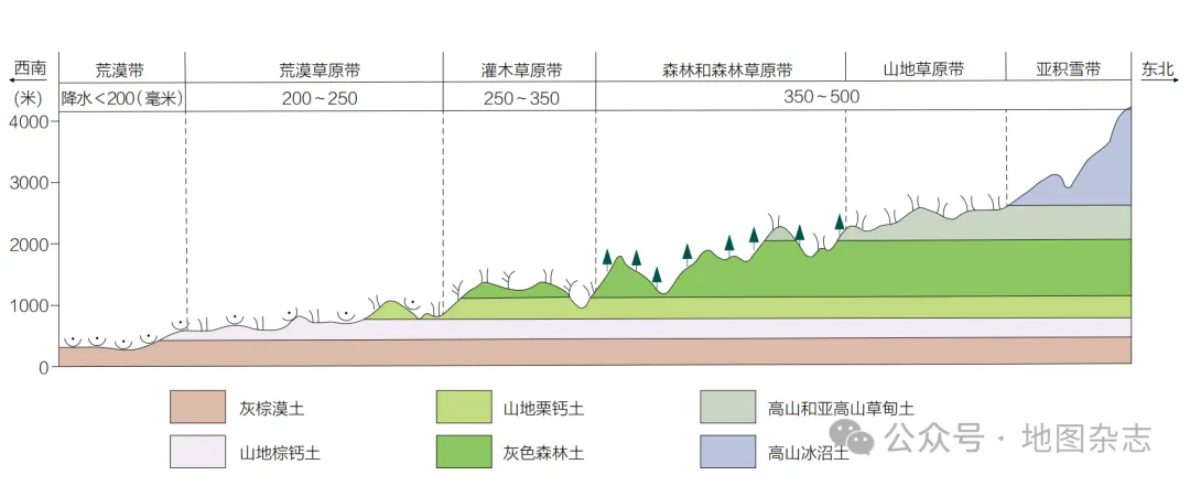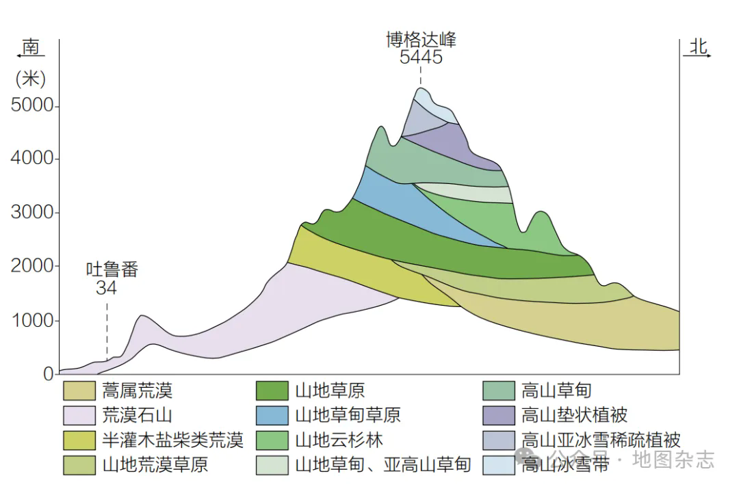 从山地的垂直分异来看,我国境内的天山东段支脉博格达山南北两坡植被类型差异巨大。博格达山南坡植被类型从山麓至山顶依次为荒漠石山、半灌木盐柴类荒漠、山地草原、山地草甸草原、高山草甸、高山亚冰雪稀疏植被、高山冰雪带。而博格达山北坡植被类型从山麓至山顶依次为蒿属荒漠,山地荒漠草原,山地草原,山地云杉林,山地草甸、亚高山草甸,高山草甸,高山垫状植被,高山冰雪带。资料来源/《中国自然地理图集》图/薛忍生