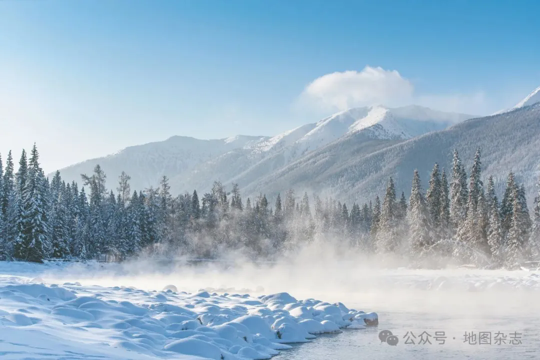 阿尔泰山地西南坡高海拔山区的冰川雪岭与低洼河谷的雾凇森林形成冰雪垂直景观带,具有“水墨世界”般的层次感