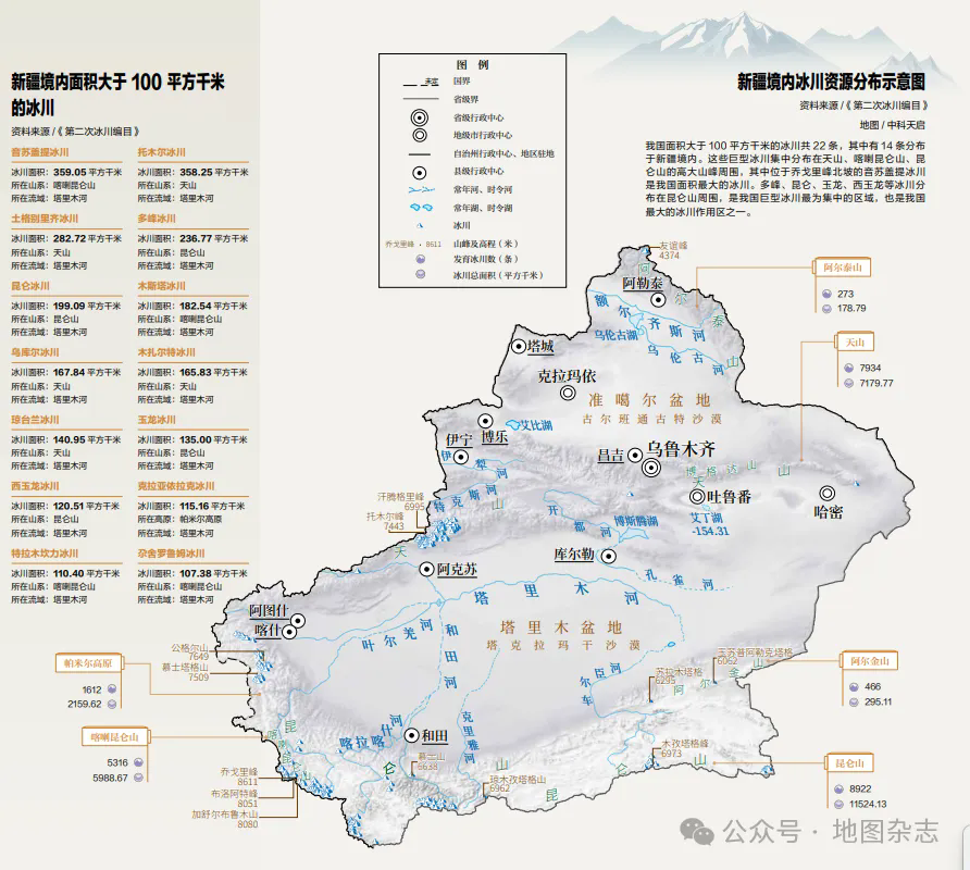 从冰川资源来看,新疆是我国冰川冰储量最多的省级行政区,拥有冰川冰储量2.13万亿立方米,占全国冰川冰储量的42.7%。新疆境内的冰川主要分布于阿尔泰山、天山、帕米尔高原、喀喇昆仑山、昆仑山、阿尔金山等区域的中高山区。其中,阿尔泰山是我国纬度最高的冰川分布区,发育有冰川273条,冰川总面积178.79平方千米,其中70%以上分布在布尔津河河源区海拔4374米的友谊峰区。天山发育有冰川7934条,冰川总面积7179.77平方千米,主要分布在南天山的阿克苏河河源区(海拔7443米的托木尔峰区及海拔6995米的汗腾格里峰区)和北天山的巴音沟河、金沟河、玛纳斯河河源区。帕米尔高原发育有冰川1612条,冰川总面积2159.62平方千米,主要分布在盖孜河、库山河河源区海拔7649米的公格尔山区。喀喇昆仑山发育有冰川5316条,冰川总面积5988.67平方千米,主要分布在克勒青河流域海拔8611米的乔戈里峰、海拔8080米的加舒尔布鲁木山、海拔8051米的布洛阿特峰等多个高峰区。昆仑山发育有冰川8922条,冰川总面积11524.13平方千米,主要分布在和田河河源区海拔6638米的慕士山区、车尔臣河河源区海拔6973米的木孜塔格峰区及克里雅河河源区海拔6962米的琼木孜塔格山区。阿尔金山发育有冰川466条,冰川总面积295.11平方千米,主要分布在塔什萨依河、瓦石峡河河源区海拔6295米的苏拉木塔格和米兰河河源区海拔6062米的玉苏普阿勒克塔格。
