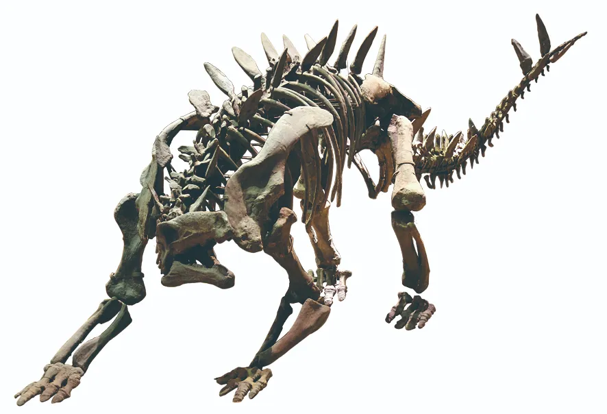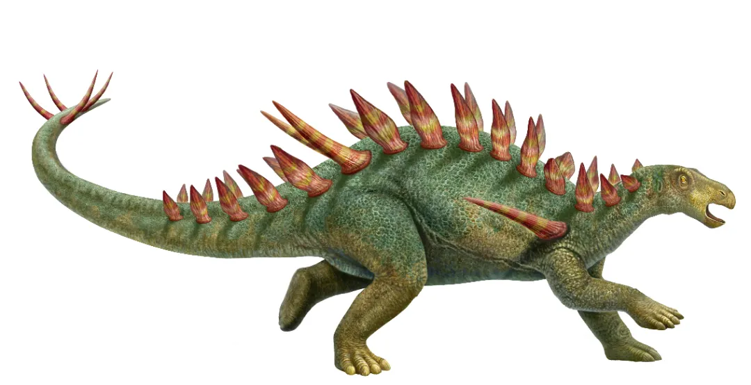 首先给大家介绍的是一种剑龙——太白华阳龙,它也是素食主义者,享有恐龙家族第一剑客的美誉。这里的“第一”,首先体现在它是目前世界上已知生存时代最早的剑龙,身上保留着不少的祖先性状,比如有较多的前上颌齿、大而开放的眼前孔、三对大的荐孔、短的前耻突和相对较长的肱骨等,为剑龙起源于亚洲的观点提供了实证。它和时代稍晚的沱江龙、巨棘龙、重庆龙一起将剑龙的演化链条勾勒完整。此外,它还是最完整的剑龙,发掘之时,从鼻尖到尾端几乎完好无损地保留下来了,特别是完整的剑龙头骨,被研究者们公认是剑龙化石发现史上的一次重大收获。2018年太白华阳龙荣登国家名片——《中国恐龙》特种邮票。当然,所谓“剑客”也不是徒有虚名,它的“宝剑”在尾部,就是四根又长又尖的尾刺,遇到敌人来犯时,只要挥动尾部,敌人就会被这四把锋利的“宝剑”吓得望而却步。它也是少数能享受“空调”的恐龙,它背上的两排骨板就是天生的空调,可以调节体温,还可以吓唬敌人。