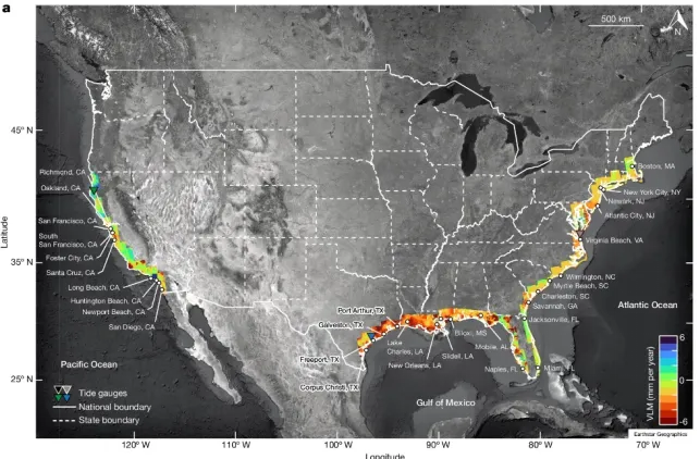 《科学》杂志在 2022 年报道称,伊朗超过 90% 的地区正在经历地面沉降,全国平均沉降速率高达每年约 6 厘米;在 2007 年至 2020 年间,美国沿海地区 32个 城市的年沉降速率中位数在 2~6 毫米之间,其中多数地区的沉降速率超过 3 毫米。