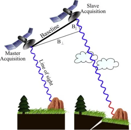 干涉合成孔径雷达(InSAR)测量地面情况的示意图