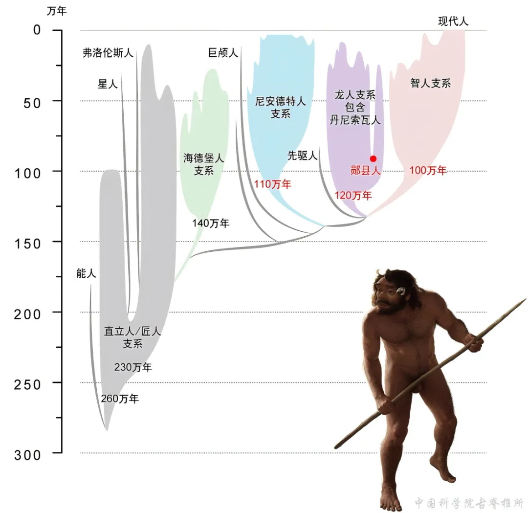 郧县人并非直立人,而是与丹尼索瓦人密切相关的龙人支系的早期代表。这说明早在100万年前,人类祖先已经分化成多个独立演化的群体,其分化时间之早、程度之复杂,远超我们过去的想象。根据这一新的谱系框架,亚洲地区多数中更新世人类化石——包括大荔、金牛山、华龙洞、许家窑、夏河、澎湖及丹尼索瓦洞穴出土标本,以及发现于松花江哈尔滨江段的龙人正型头骨——都可归入龙人支系。该支系与智人拥有最近的共同祖先。