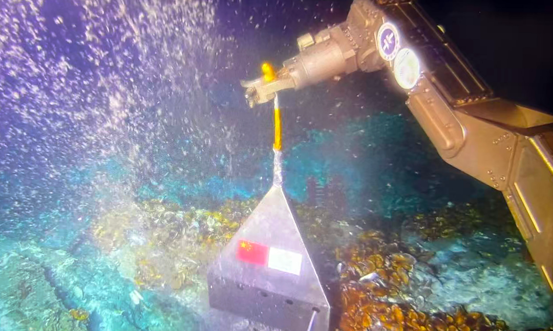 在南海北部“海马冷泉区”,“海马”号潜入1522米深的海底。科研人员在科考船上对机械臂进行远程操控,使用特制的采集舱,精准收集到从冷泉口渗出的可燃冰及其伴生气。