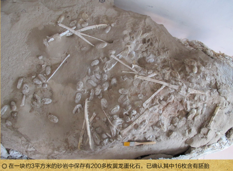 科考队考察了上千平方千米的戈壁荒漠,对翼龙化石的分布范围、富集和埋藏规律有了深入的认识。在灰白色湖相砂岩中,夹有富集翼龙蛋和头骨等骨骼化石的红色泥岩砾屑的风暴沉积层,厚10~30厘米。在2.2米的剖面上,有8层富含翼龙化石,其中4层同时含有翼龙蛋化石。