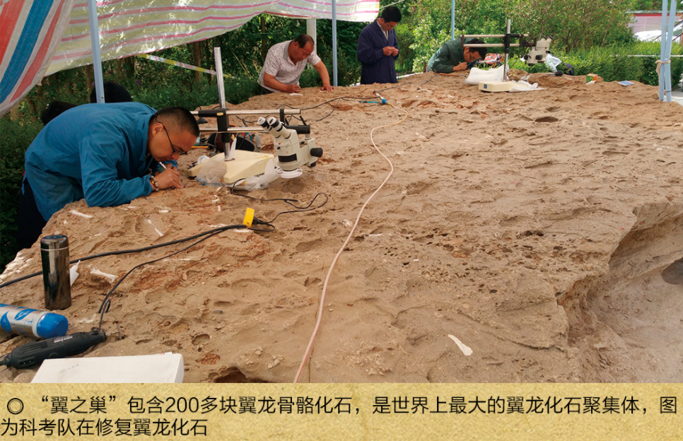 2016年,科考队在哈密野外考察时发现一件巨大的化石标本:约6米长、4米宽、1米厚,重16吨,保存有200多块翼龙骨骼,10多个翼龙头骨,还有两块恐龙骨骼共生。科考队从戈壁深处将其运出,并对化石进行修复,将这件化石放置在哈密博物馆的广场上。这是世界上已知最大的翼龙化石聚集体标本,被命名为“翼之巢”。