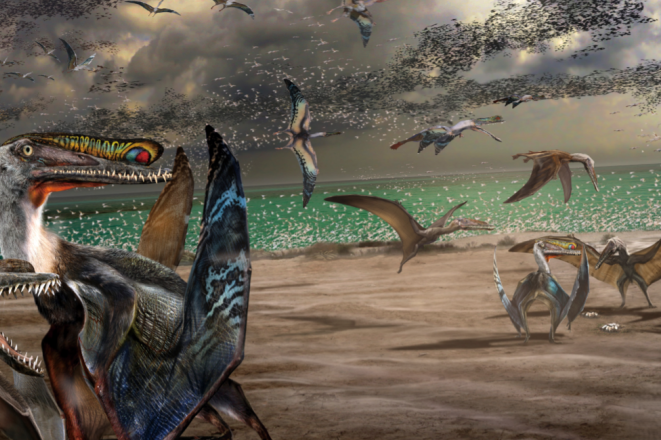 翼龙,与恐龙同时代存在,执掌空中霸权长达1.6亿年的爬行动物,靠加长的第4指支撑的翼膜飞向蓝天的奇特生物,最终在白垩纪末期灭绝消失在历史长河中。曾经的翼龙伊甸园,也在沧海桑田的地质变迁中变幻成如今的茫茫戈壁。留在砾石间的精美化石,作为亿万年前生命的见证,令人感慨大自然的神奇,也留下人们对翼龙伊甸园昔日盛况的遐想。
