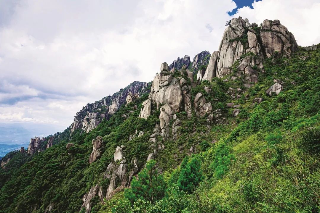 花岗岩是深成岩浆岩,它是由地下深处炽热的岩浆上升失热冷凝而成。这些花岗岩在数千万至上亿年前侵入到地表以下 3 公里深。南岭处于造山带中,经过多次地壳抬升,上覆厚厚的岩层被侵蚀殆尽,现出露地表形成高耸的山岳。南方湿润多雨的气候使花岗岩风化剥蚀,深厚的花岗岩风化壳是南岭肥沃土壤的成土母质,植被覆盖率极高,整个花岗岩山峰连绵起伏,层峦叠嶂,葱葱郁郁。