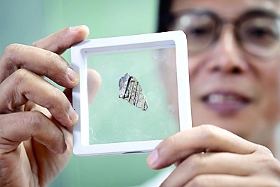 研究人员展示在广东三水盆地发现的恐龙牙齿化石。新华社发