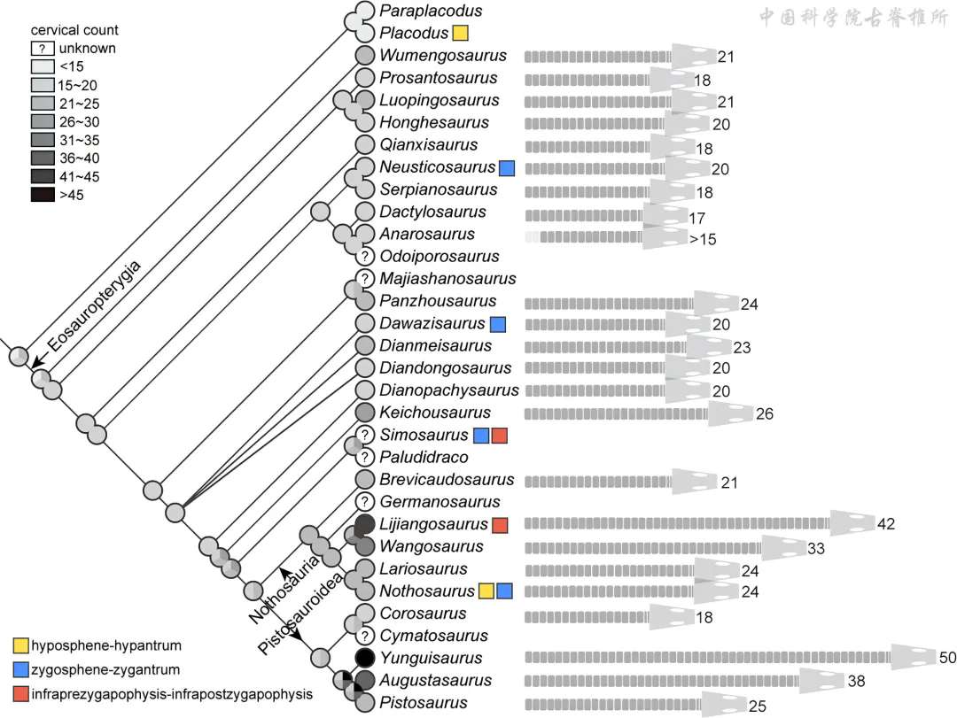 图3 颈椎数量及椎间辅助关节在鳍龙类中的演化(海爬课题组供图)