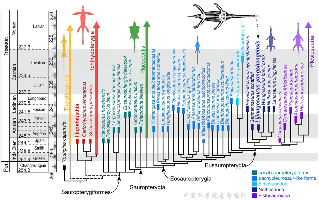 化石保存在一块巨大的石灰岩表面,经过古脊椎所技术人员的修理,暴露出一具体长超过2.5米的鳍龙类骨架。根据缺乏翼间窗、颌关节与枕髁平齐、咽鼓管孔位等头骨特征,以及肩带和肱骨的形态,研究者确定其属于幻龙类(Nothosauria)。基于目前包含三叠纪鳍龙类最完善的形态矩阵,研究者开展了系统发育分析,其结果进一步确定了永胜丽江龙属于幻龙类。然而,永胜丽江龙的颈椎数量达到了惊人的42节,远超其他幻龙类中常见的20多节颈椎,甚至比早期的蛇颈龙还要多。