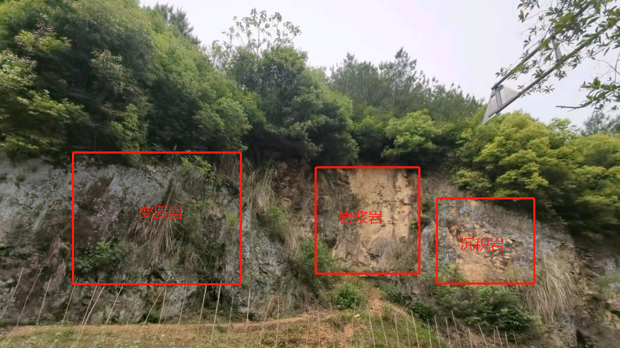 据浙江省第七地质大队自然资源环境调查研究院副院长李春忠介绍,这左、中、右三处岩石的类别和年龄都不同,特别是年龄差距非常大,相差有数亿年。“左侧的是古元古代-晚古生代龙泉俯冲增生杂岩变质岩,年龄层形成很早,最保守的话,也有4亿年;右侧像鹅卵石的那块,是早侏罗世枫坪组沉积岩,年龄大约是在1.7-2.0亿年,这两大类岩石至少有2亿年的时间跨度。中间的是晚侏罗世侵入岩(岩浆岩),大约是1.5亿年。”李春忠说。
