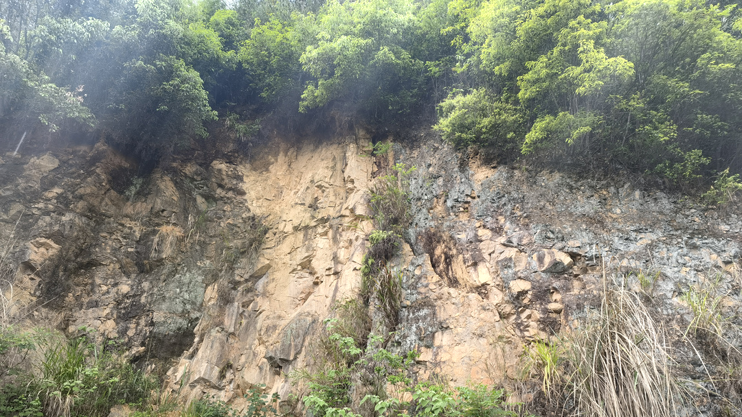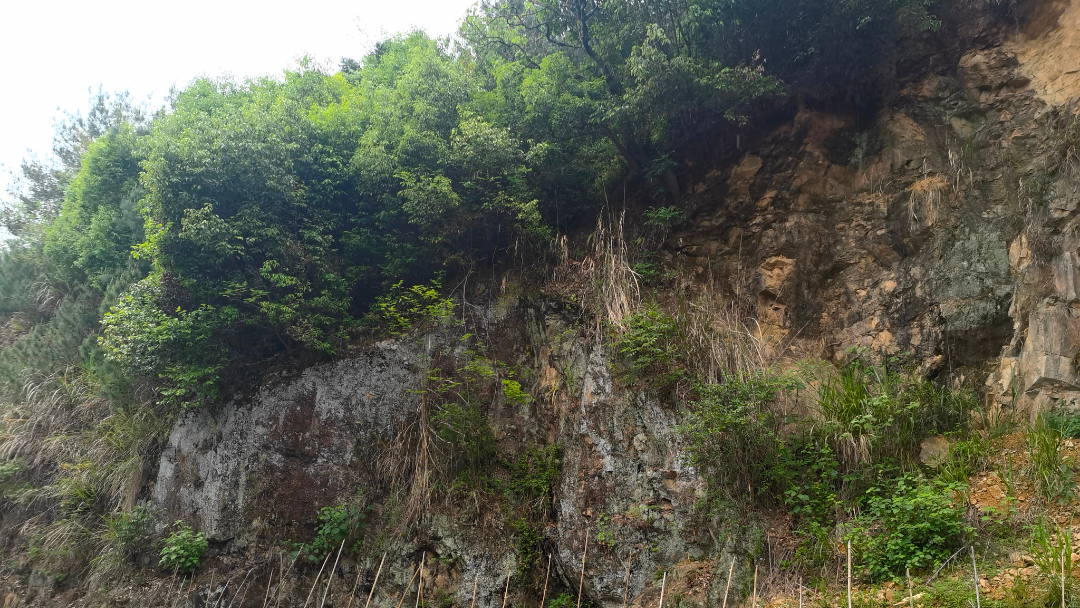 这处神奇地质景观就在百山祖国家公园龙泉片区的兰巨乡五梅垟村公路边。低矮的树丛、凌乱的杂草、裸露的岩壁,岩壁下方还被村民们种上了蔬菜。粗粗一看,跟别处似乎没什么区别。但若细细观察,便会发现左、中、右处的岩壁兼有些不同,特别是右侧岩壁,似有些鹅卵石镶嵌在里面。