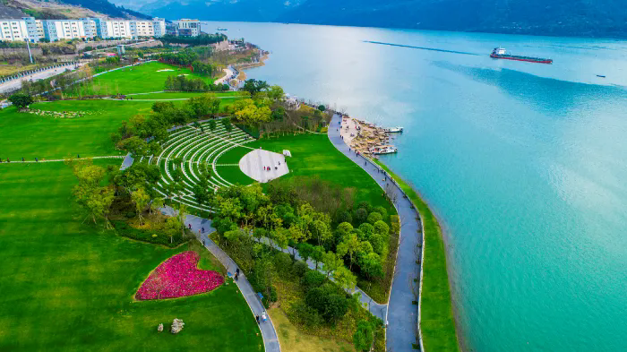 目光从张飞庙的朱楼飞檐转向北侧,33千米长的云阳世界地质公园环湖绿道便沿长江亲水岸线铺展。这座千年庙宇的古朴气韵,与绿道的现代生态之美隔江呼应。云阳环湖绿道是城市滨水空间建设的典型范例,该绿道全长33千米,沿云阳县城亲水岸线而建,于2014年随县城沿江库岸环境综合治理项目启动建设,历经7年完工,将昔日荒滩改造为集生态、休闲、文化于一体的城市公共空间。