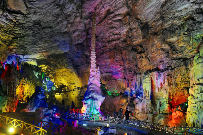 龙缸天坑的雄奇尚未尽收眼底,其附近龙洞便接续展现喀斯特的地下奇观,天坑的地上险峻与龙洞的地下精巧,构成云阳世界地质公园喀斯特地貌的一体两面。龙洞坐落于云阳清水乡8组三叠系嘉陵江组石灰岩地层,因民间传说洞中有龙而得名。其洞口位于溶蚀槽谷,洞内发育有丰富的石钟乳、石笋、石柱、石幔、石瀑等岩溶景观。龙洞由前后两处大厅构成,前厅呈圆形,长200米、高20米,面积达4800平方米;后厅为五边形,高30米,面积近6000平方米。除了极具观赏价值的岩溶景观,龙洞凭借其稳定的内部环境,呈现出冬暖夏凉的特征。