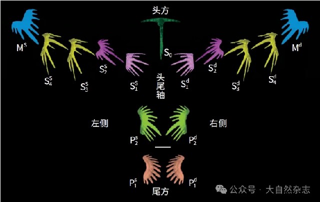 除直观重现多分子构成外,牙形动物口咽器官的空间结构也通过不同的标本得以还原。以司克泰舟石属和小厚颚石属的研究结果为依据,结合前人报道的奥泽克亚目和锯片石亚目系列运动学进行分析,我们首次基于化石证据确定了闭合状态下牙形动物口咽器官中不同类型牙形石的位置及方向,推测外侧的M分子和中间的S0分子从口部向腹方做往复运动,起到主动捕食的作用;而向内包裹的指掌状分子S1和S2通过口咽器官,沿头尾轴向上做相向运动,起到输送食物的作用。如此微小的生物个体竟然拥有这么复杂、精妙的进食结构,实在令人赞叹。