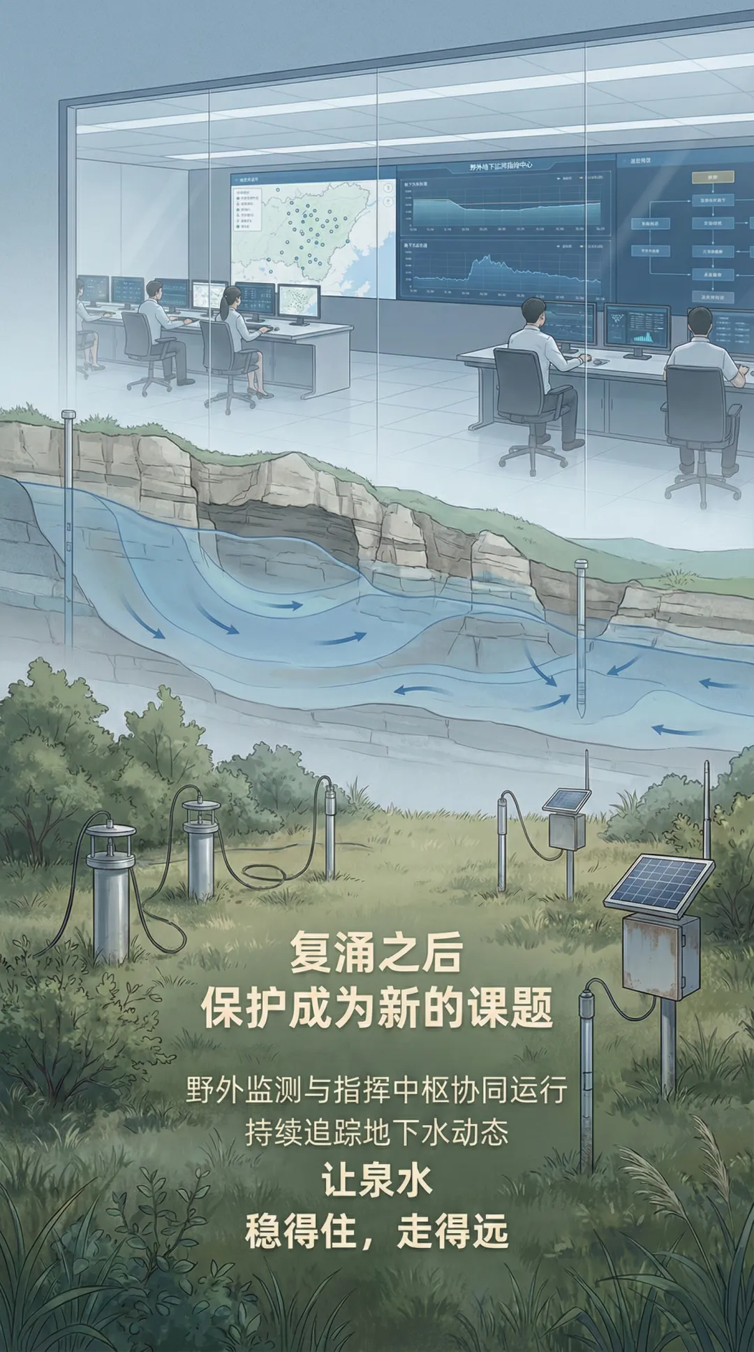 地质九队于2024年研发建成百泉泉域监测指挥中心,实时掌握百泉泉域岩溶水动态和主要泉眼状态,辅助制定保泉措施。