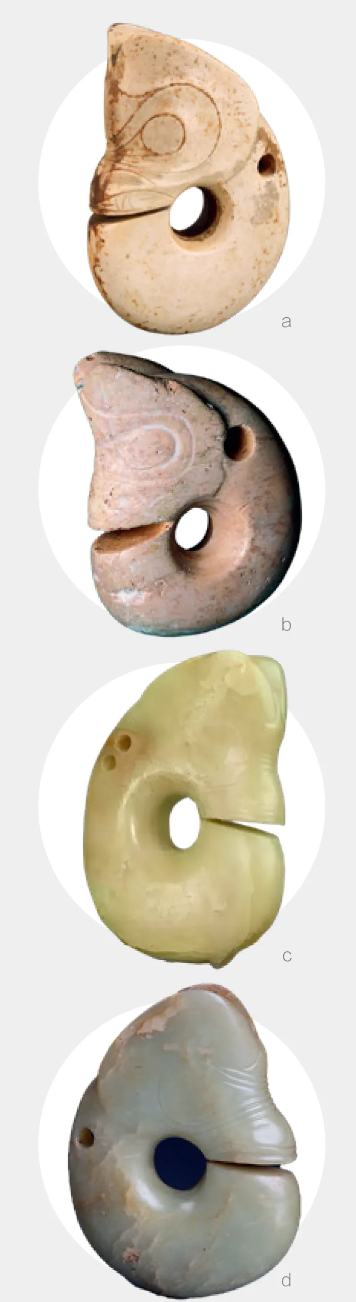 玉猪龙(a、b、c、d 分别藏于辽宁省博物馆、中国国家博物馆、首都博物馆和天津博物馆。图片均来自以上博物馆官网)