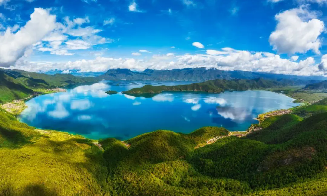 泸沽湖四周青山环抱,湖岸曲折多湾,共有17个沙滩、14个海湾;湖中散布5个全岛、3个半岛、1个海堤连岛,这些岛屿一般高出水面15至30米,珍珠翡翠般飘浮在湖面。