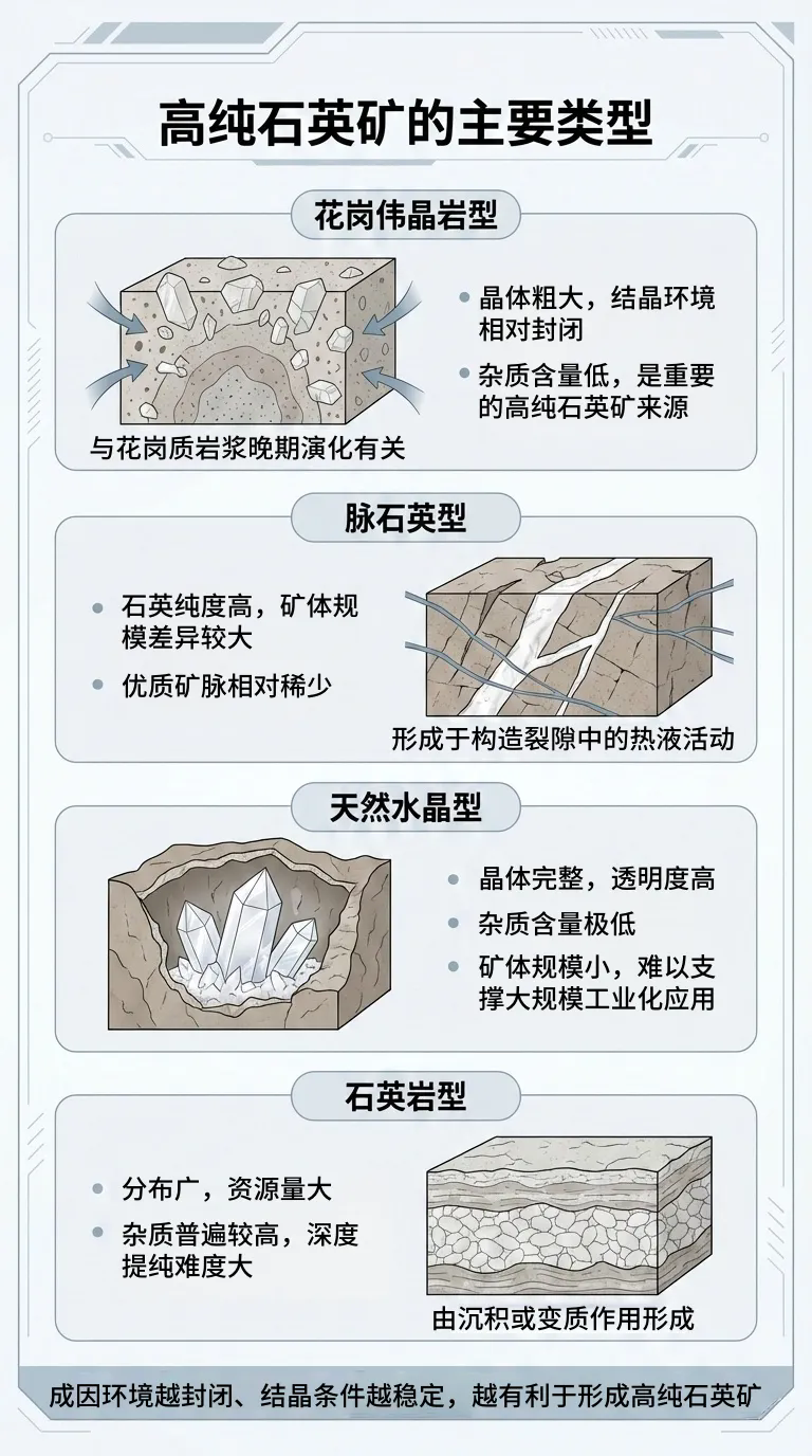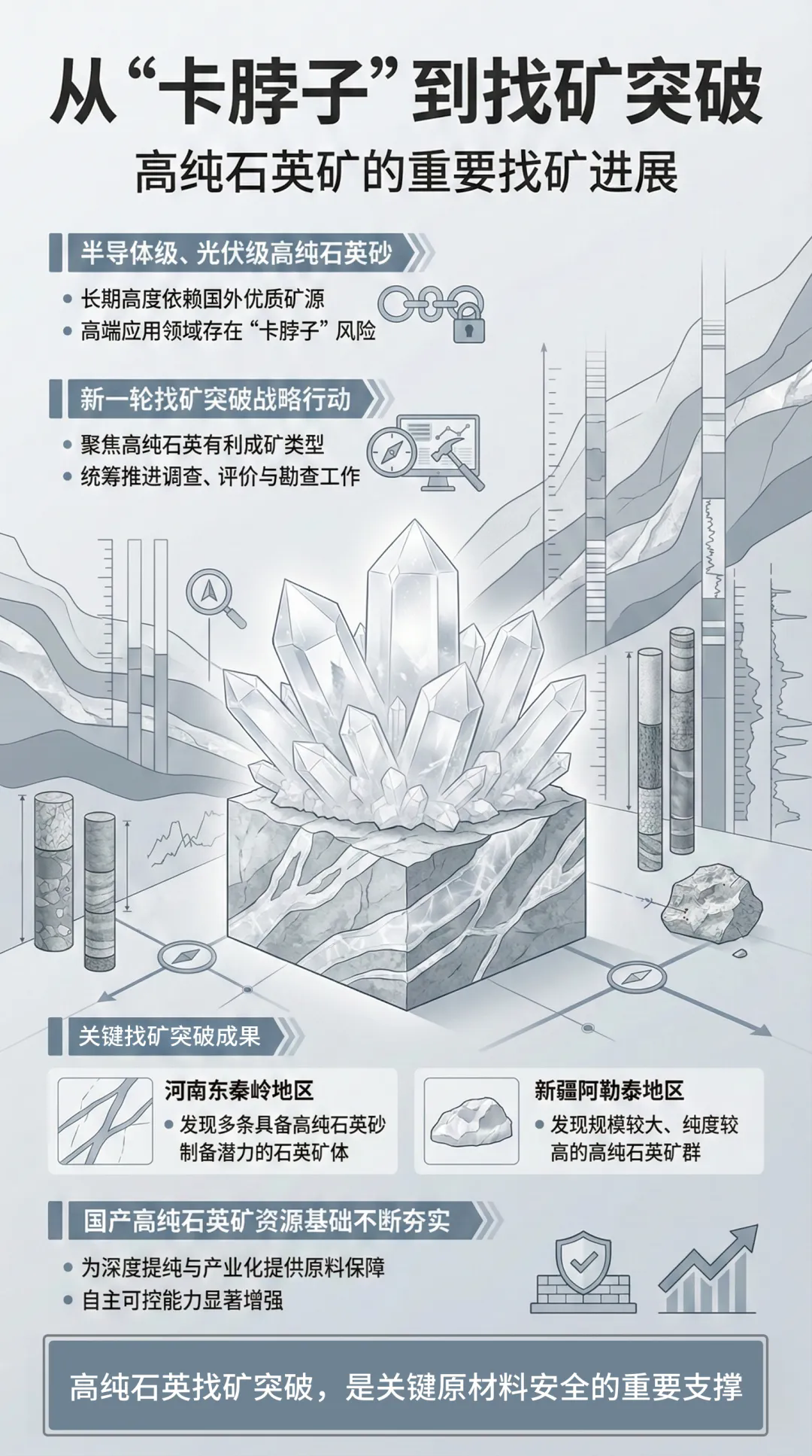 为更直观地呈现这一新矿种的科学内涵与现实价值,今天,我们系统梳理了高纯石英矿的成因类型、关键性能、典型应用及找矿进展,并对“高纯为何难”“价值何在”作出简明解读,力求以清晰、可视化的表达,呈现这一“白色钻石”背后的地质机理与现实价值,也让读者更直观地理解关键基础材料与资源保障、科技创新之间的内在联系。