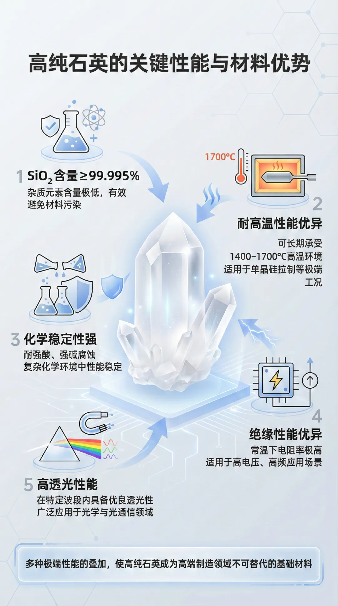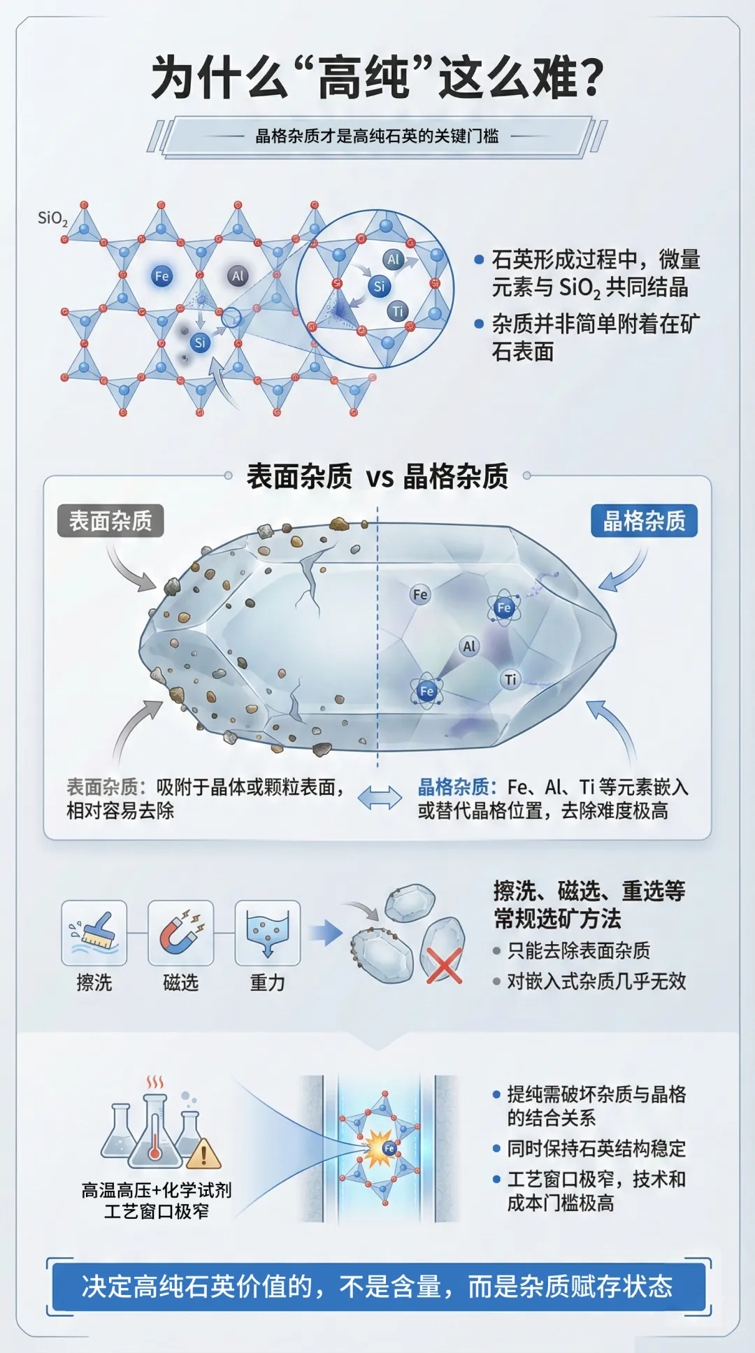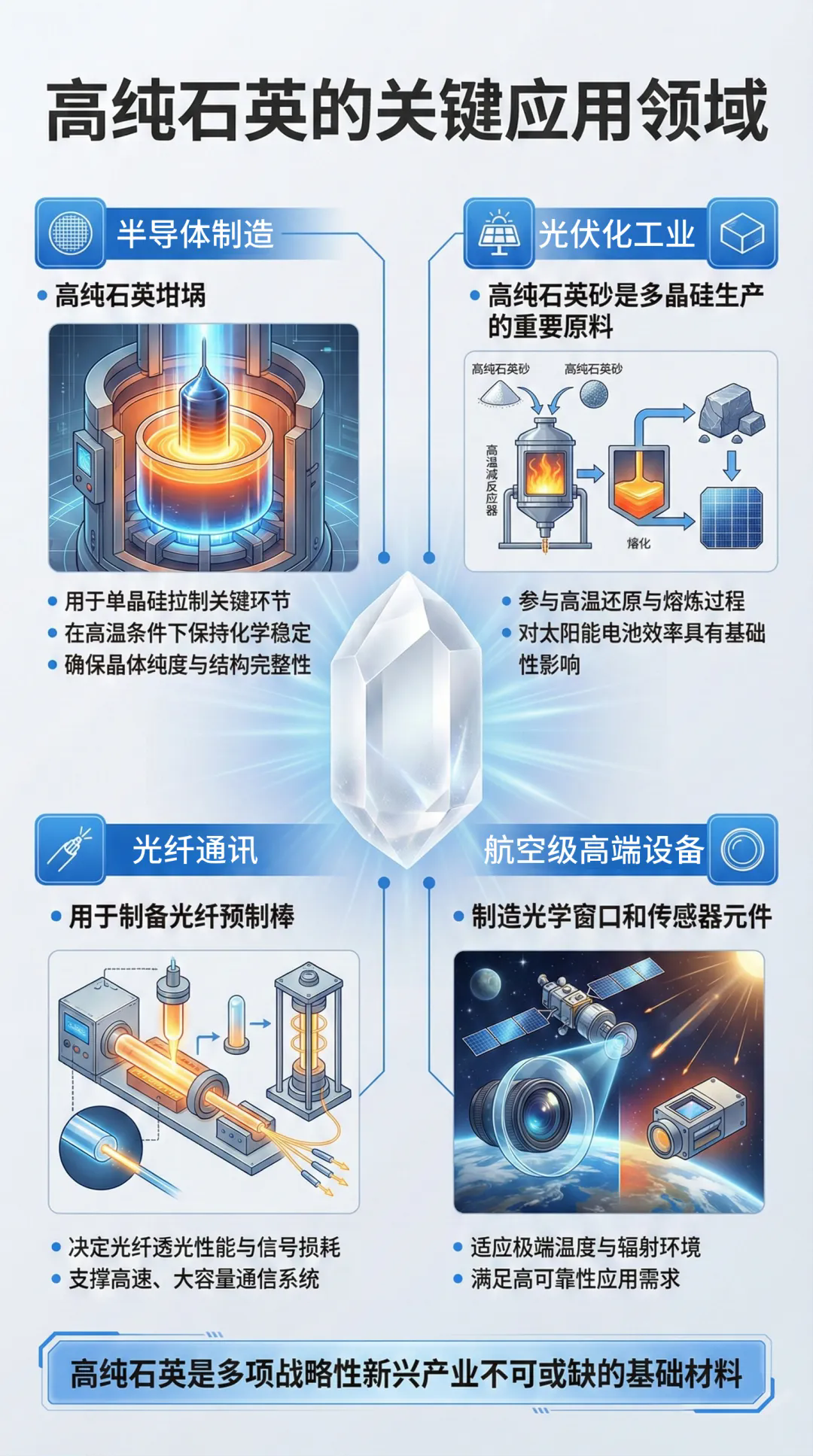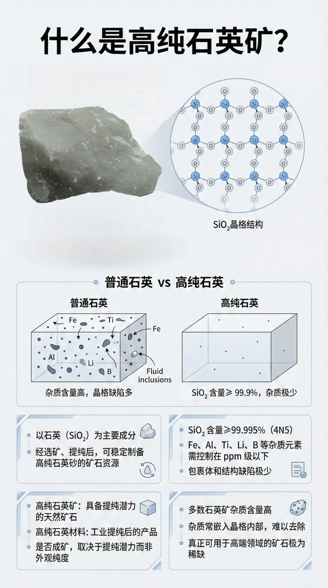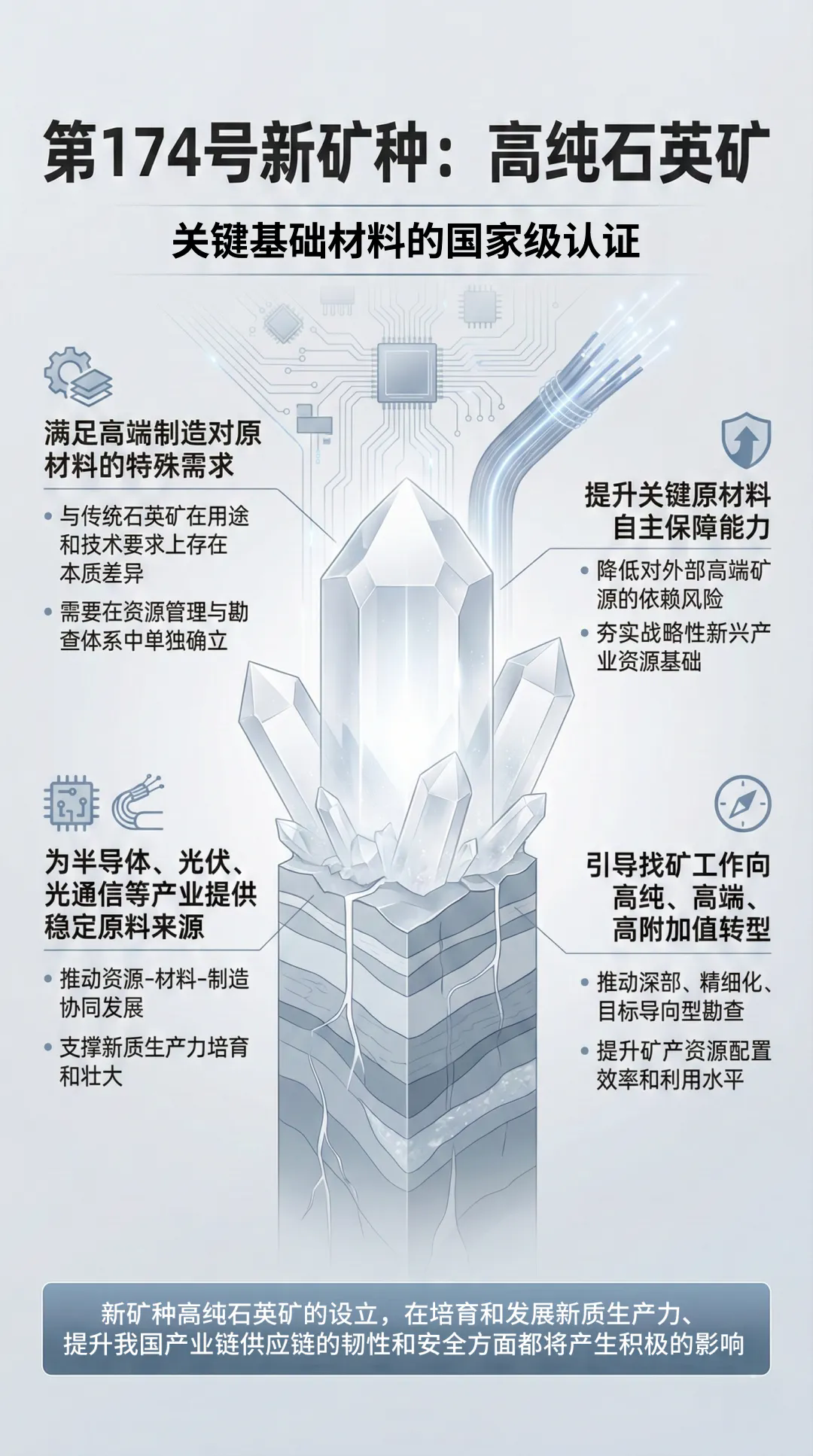 高纯石英矿,是支撑半导体、光伏、光通信等高端制造领域的关键基础材料。随着我国高纯石英矿被正式列为第174号新矿种,其资源属性、技术门槛和战略意义日益受到关注。它看似寻常,却对纯度、杂质控制与加工工艺提出极高要求,真正可用于高端领域的优质资源更显稀缺。