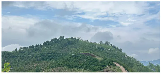 上部的石灰岩完全崩塌,山坡上偶尔散落一些石块,变为圆顶的普通山体形态。独有的特征已消失殆尽。