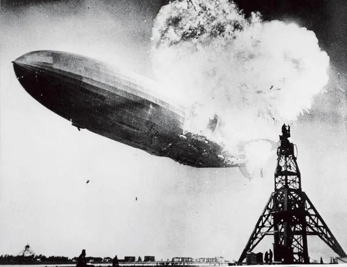 1937年5月6日下午约7时30分,“兴登堡号”飞艇在美国新泽西州莱克赫斯特海军航空总站上空准备着陆时,一个火花点燃了泄露的氢气,仅用34秒,整艘飞艇便被熊熊烈火吞噬。